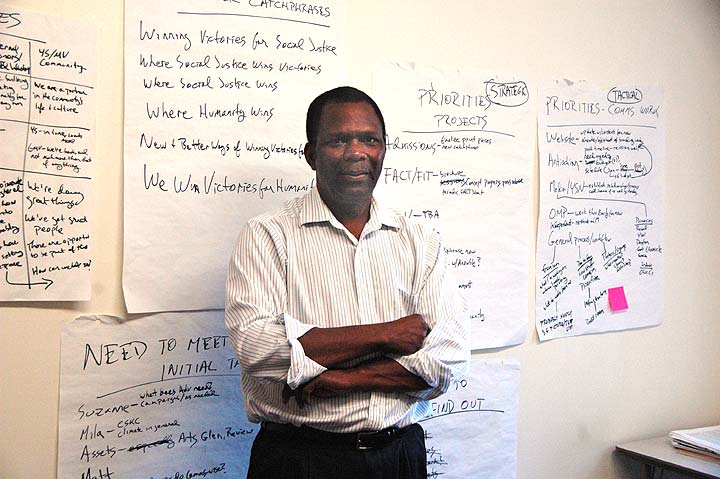 Mark Reynolds was recently hired as director of communications and marketing for Antioch College. While the post is new to him, the college is not: he’s a 1980 graduate and has been active as an alumni board member and advisor since the college’s closure. He recently posed in front of his “brainstorming” wall in his new office. (Photo by Audrey Hackett)