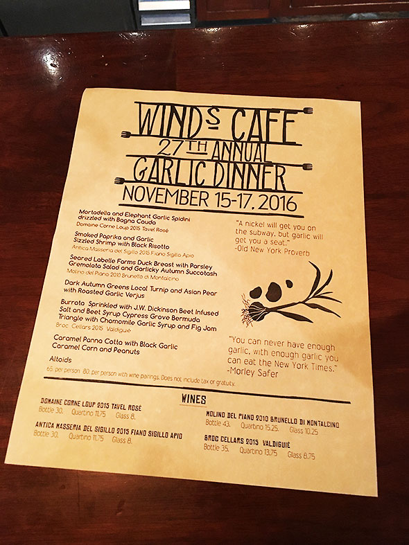 I didn’t eat much for the first half of the month. I skipped out on breakfast or lunch for several days dropping weight like seed from a loose-sown sack. I had dropped seven pounds in as many days when I decided it was time to break my haphazard fast with a proper meal or at least a hearty salad. I dropped in the Winds Cafe Tuesday evening to be greeted by the blooming scent of roasted garlic. The restaurant’s annual garlic dinner was in full swing. I breathed deeply and ponied up to the bar.