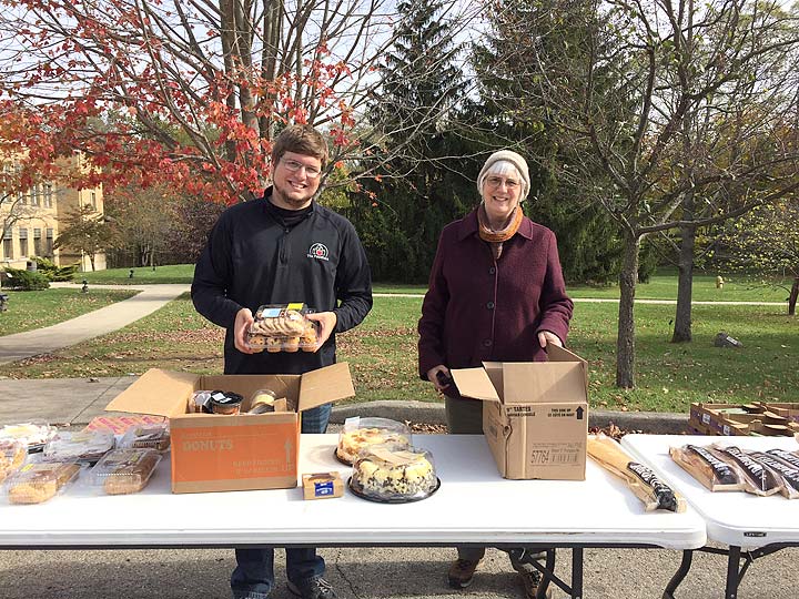 The Dayton Foodbank’s Andy Macy and Yellow Springs resident and volunteer Susan Pfeiffer distributed food items in Yellow Springs last month as part of the Foodbank’s mobile pantry. The pantry stops every fourth Tuesday of the month in Yellow Springs, and aims to provide food items to the quarter of the Yellow Springs population that qualifies to receive it. (Submitted photo)