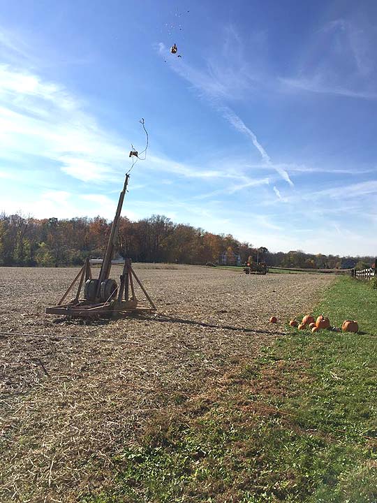 The Mullin family’s 13th annual Pumpkin Launch at Moonshadow Farm off of St. Rte. 370 launched another victim via a homemade trebuchet, Saturday, Nov 7. The aging squash’s scary scowl (carved by Eliza Minde-Berman) seemed to change to one of shock and surprise as it flew to its ultimate demise. The farthest launch of the day covered 215 feet; altogether over 30 pumpkins were sent sailing. (Submitted photo by Jennifer Berman)
