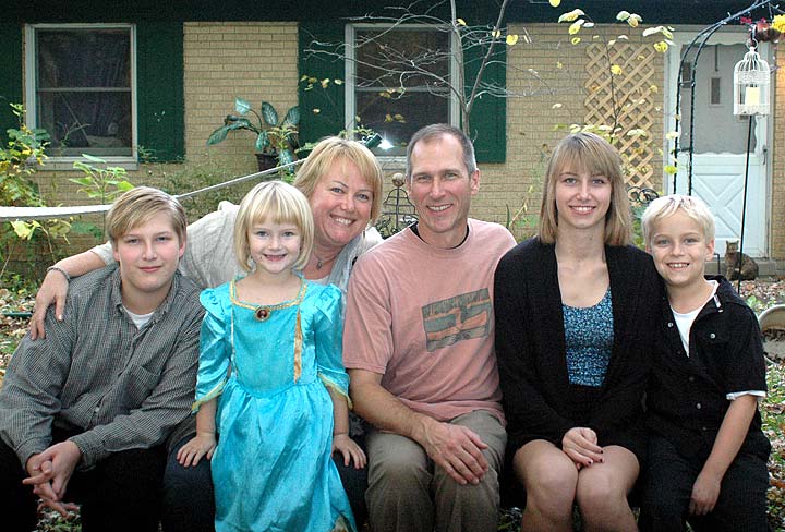Zo Van Eaton Meister and Dave Meister moved to Yellow Springs in 2009. For Zo, it was a homecoming to a village she’d been connected to since she was a child. The whole family is pictured in front of their Fair Acres home: from left, Sven, Kate, Zo, Dave, Jane and Nicholas. (Photo by Audrey Hackett)