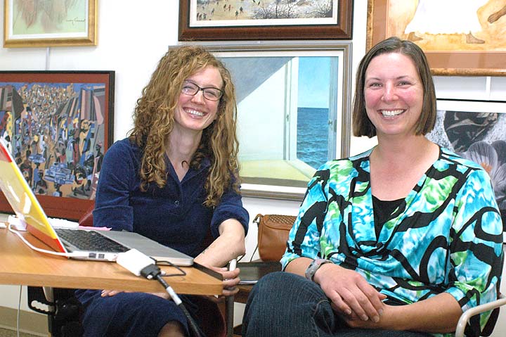 Lauren Craig, left, and Laura Skidmore are two members of the Yellow Springs organizing team of Mothers Out Front, a national grassroots nonprofit seeking a “livable climate” for future generations. Meetings of the local team, started by Skidmore this spring, have drawn about 13 area women. All mothers, grandmothers and women with children in their lives are invited to join with the local group’s advocacy of renewable energy and other climate-friendly solutions. (Photo by Audrey Hackett)