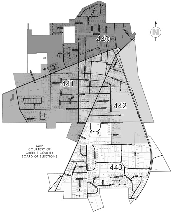 Voter turnout was strong, with 76 percent turnout overall, exceeding Greene County’s total turnout of 71 percent. Precinct 440 had the highest turnout, 81 percent.