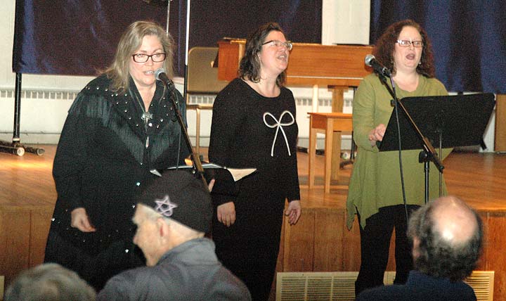 From left, Lori Askeland, Amy Magnus and Jennifer Gilchrist, performing as Fire Horse Trio, harmonized to a packed house at WinterSong Encore at First Presbyterian last Saturday. Emceed by “Elder Felder” Jim Felder, who also thrilled audiences with several songs, the event featured more than 20 local musicians and singers, and included a stirring version of Leonard Cohen’s “Hallelujah” sung by David Walker, with Brian Walker on keyboard and Jeanna GunderKline on backup vocals. (Photo by Audrey Hackett)