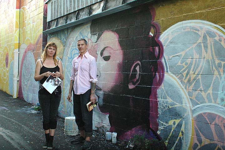 Sarah Dixon rendered legendary pop/funk/rock musician Prince, while Pierre Nagley continued work on an abstract study in yellows and oranges with white swirls in Kieth’s Alley. (Photo by Matt Minde)