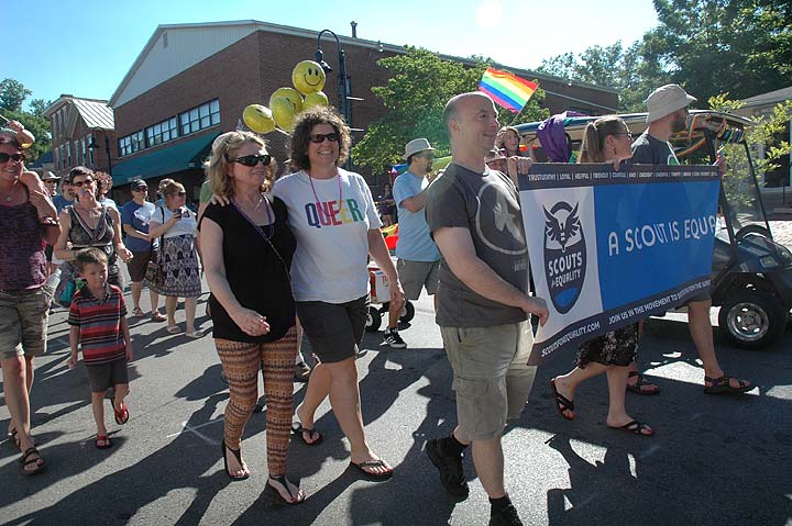 Several hundred villagers celebrated diversity and equality during Yellow Springs Pride events last June. Shown above at the fifth annual parade are Andi and DeLaine Adkins and Chris Wyatt of Scouts for Equality. (Photo by Diane Chiddister)