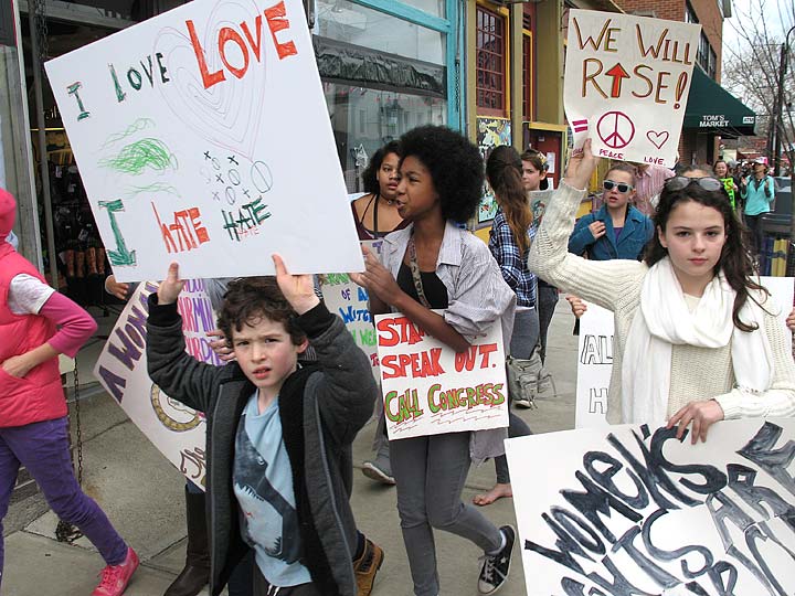 At least 250 villagers took to the sidewalks in downtown Yellow Springs last Saturday, Jan. 21, marching in solidarity with the Women’s March on Washington and hundreds of other marches around the country and world. The local Sister March was organized by McKinney Middle School seventh-graders Carina Basora and Ava Schell, who set out to create a positive event for all ages in support of equality and women’s rights. Judging by the march’s impressive attendance and joyful vibe — and the abundance of young, determined marchers, including, from left, Oskar Dennis, Malaya Booth and Vivian Bryan — they succeeded.
