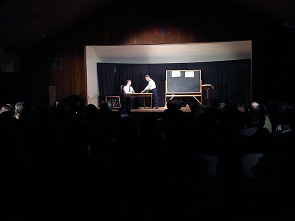 His play The Colonel and The Major was listed fourth on the playbill followed by the play The Making of Sailor written by Joshua Hayward and directed by Colton Pitstick. On the nights of the performance, I waited in the wings dressed in my fortune teller garb and listened to Thor Sage’s booming voice and my husband’s answering call on stage. I also listened to the audience as the two actors reeled into combat. Thor and Jeremy drew out belly laughs from the audience but also gasps of surprise. Saturday night went especially well culminating in a hardy round of applause. As they both retreated from stage and advanced toward the green room, I caught a glimpse of the two men dressed in bright limelight and the same blue uniform. They looked at it other in accord and threw their arms up triumph…such a happy contrast to their onstage personas that I almost laughed out loud.