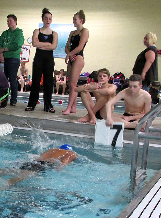 The YSHS Bulldog swim team set a few school records at their last two meets, including a first-place finish in the girls 400-yard freestyle relay at the Bethel High School Invitational on Dec. 18. Above, teammates Hannah Morrison and Olivia Chick watch as David Walker swims the 500 freestyle. (Submitted photo)