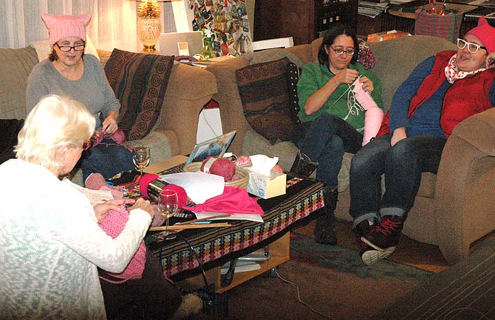 Sikes described her state of mind in response to a question about her reasons for going to the march as she crocheted a pink, cat-eared “pussy” hat Monday evening during a knitting/crochet party at the home of Eve Fleck. The gathering was in response to the Pussyhat Project, a national initiative to provide the people of the Women’s March “a means to make a unique collective visual state which will help activists be better heard,” according to project organizers. Fleck has already made several hats to share with marchers and has secured a quantity of yarn in various shades of pink for others in town who would like to join the handicraft effort.
