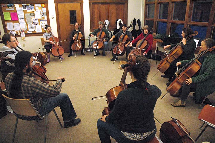 The 2017 Cello Springs Festival continued Monday evening with an informal cello technique forum at the Rockford Chapel social room, with participating cellists of abilities ranging from beginner to world-class. Upcoming events include a performance of all six suites for unaccompanied cello by J. S. Bach on Thursday evening, Jan. 12, at 5 p.m. in the Herndon Gallery; a jam session at the Emporium on Friday, Jan. 13, at 2 p.m.; and a closing concert at Antioch College’s Foundry Theater, Saturday, Jan. 14, at 7:30 p.m.