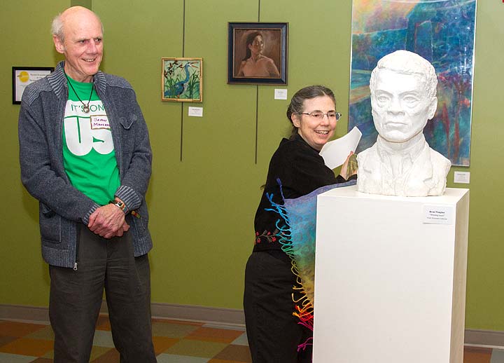 The YS Arts Council and the YS Historical Society presented “Beyond Flour and Sugar: The Wheeling Gaunt Legacy and Yellow Springs In the Civil War Era” on Friday, Jan. 20, at Antioch University Midwest. Talks were given by Dave Neuhardt and Steven Deal chronicling village life during the Civil War and the history of Wheeling Gaunt, who was a former slave and prominent village philanthropist in the 19th century. Pictured here, sculptor Brian Maughan watched as Gallery Coordinator Nancy Mellon unveiled his new work, a bust of Gaunt. The sculpture was added to the YS Arts Council’s permanent collection.