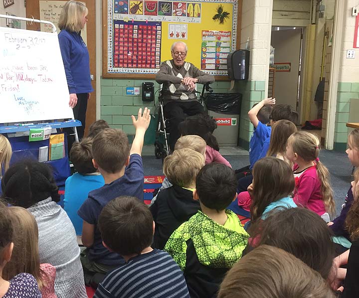Students in Linnea Denman’s kindergarten class at Mills Lawn got a special visitor on their 102nd day of school: Lloyd Kennedy, who is 102. Kennedy spoke with the students and shared what life was like when he was their age. The students were surprised to learn that Kennedy and his family had to raise their own food, which was stored in an ice box (with an actual block of ice for cooling), that he had no indoor plumbing and had to walk about a mile to school. This was all fascinating, but the students were most impressed that Kennedy had once met Dr. Martin Luther King Jr.
