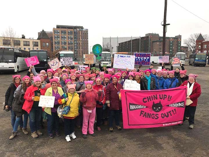 After riding through the night via chartered bus, and deposited in a Washington, D.C., parking lot after sunrise Saturday, Jan. 21, 55 women from Yellow Springs prepared to join hundreds of thousands of people from across the country streaming toward the National Mall for Saturday’s Women’s March on Washington. The bus passengers represented a portion of village residents who particpated in the historic event. (Submitted photo by Lydia, the busdriver)