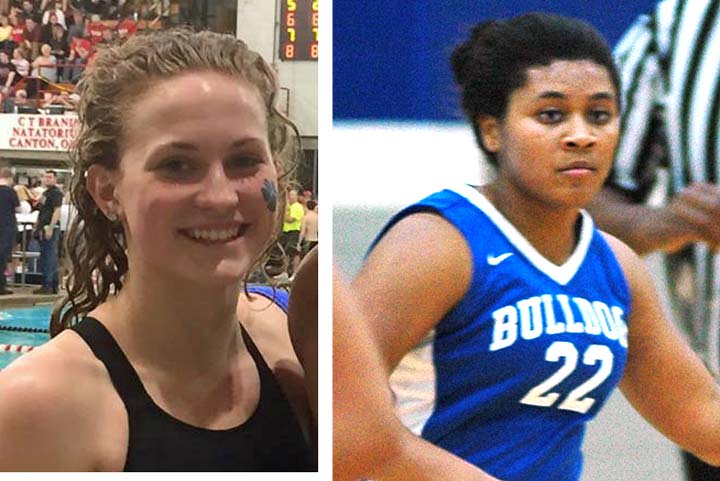 Two Yellow Springs High School athletes were recently recognized for their impressive career performances. Senior swimmer Olivia Chick was named the Metro Buckeye Conference’s Swimmer of the Year, shown here at the 2016 State Meet. Senior Elizabeth Smith recently logged more than 1,500 points during her tenure as a Bulldog basketball player, shown here playing the Miami Valley Rams in December 2015. (Left, submitted photo; right, photo by Dylan Taylor-Lehman)