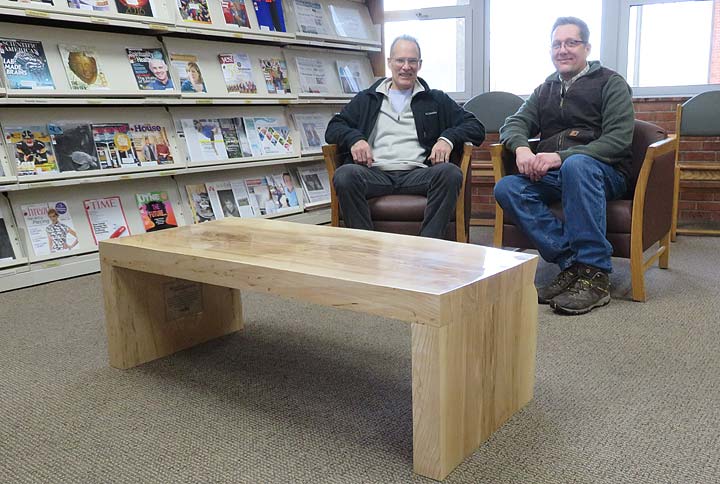 A woodworker by trade, Hawley has recently switched over to a new water-based finish, which was also used on the library’s table. The finish is not only less harmful to the environment but is also “less stinky” than more traditional finishes, Hawley said, which allowed him to work on the project in the comfort of his home when it was too cold to be in his woodshop. The finish was actually developed in response to California’s stricter laws on the manufacture of motor vehicles, he said.