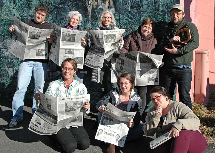 For the seventh year in a row, the Yellow Springs News won the top prize among weekly newspapers of its size at the Ohio Newspaper Association’s annual convention. The paper also came home with 14 individual awards, in categories ranging from editorials to advertising design. Pictured here is the award-winning team of (back row, from left) Matt Minde, Diane Chiddister, Audrey Hackett, Kathryn Hitchcock and Dylan Taylor-Lehman, as well as (front row, from left) Robert Hasek, Suzanne Szempruch and Lauren “Chuck” Shows. (Photo by Matt Minde, Suzanne Szempruch and the timer)