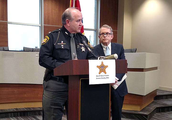 Greene County Sheriff Gene Fischer addressed reporters at a press conference in Xenia on Jan. 25, announcing that two suspects had been arrested in the shooting deaths of William "Skip" Brown and Sherri Mendenhall. Ohio Attorney General Mike DeWine also spoke at the conference. (Photo by Dylan Taylor-Lehman)
