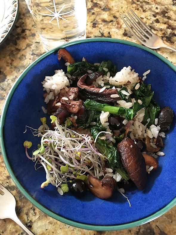 We’re used to thinking of the summer as the time of great bounty in local foods but winter has been bountiful too. I picked a bag of mushrooms from Flying Mouse Farms two weeks ago. These Shiitake mushrooms…or what my husband Jeremy calls Chautauqua mushrooms…have milk white centers. So meaty and fresh that Jeremy snacks on them raw right out of the refrigerator. I’ve learned to not leave them alone on the kitchen counter.