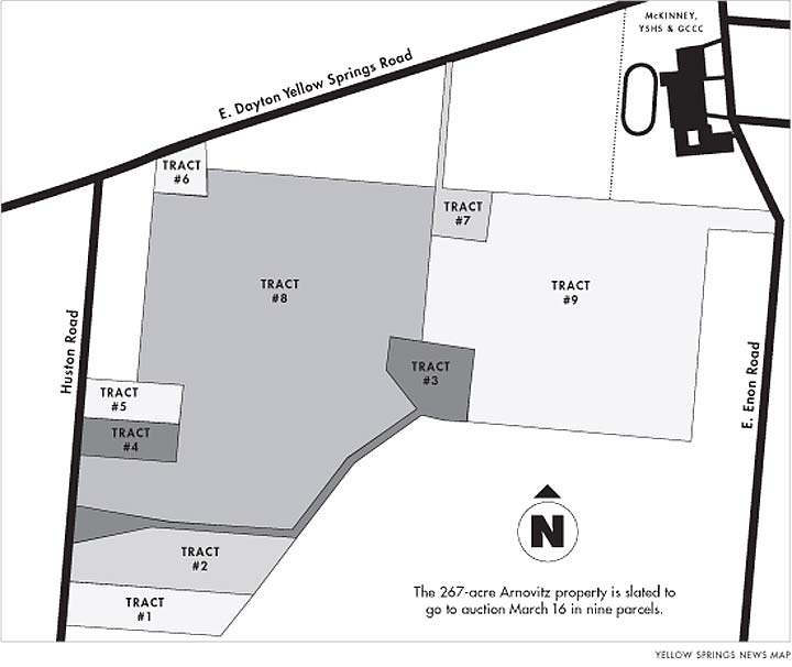 The land is located just west of Yellow Springs, behind and slightly south of Yellow Springs High School (see map on page 5). While none of the land fronts on Dayton-Yellow Springs Road, it lies directly south of parcels owned by Max and Inge Lake and Rick and Mary Donahoe that do front on the road. The land has been divided into nine tracts for the auction, with several tracts fronting on Huston Road.