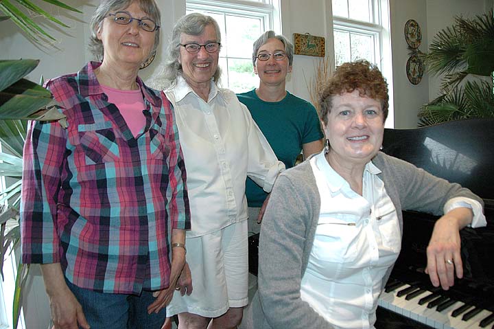 The board of the Yellow Springs Youth Orchestra Association is launching a new membership drive. Shown above are board members, from left, Carolyn Ray, Shirley Mullins, Liz Blakelock and Cammy Dell Grote at the piano. Not shown are Jeff Huntington, Scott Kellogg and Dennis Farmer. (Photo by Diane Chiddister)