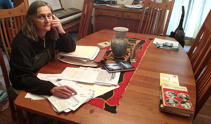 Wright State Universtiy psychology professor and Yellow Springs resident Cheryl Meyer sat with the collection of suicide notes that formed the backbone of a recent study of suicide. With three colleagues, she published the results of her research in a book called “Explaining Suicide.” The unusually large collection of notes provided data that allowed researchers to pursue aspects of the phenomenon that hadn’t yet been studied. (Photo by Dylan Taylor-Lehman)