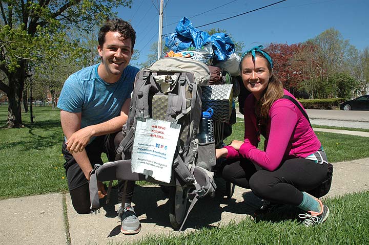 Abby Bongaarts, 24, and Danny Finnegan, 23, stopped in Yellow Springs this week as part of their walk across the USA. They left Long Island on March 1 and are aiming to make it to San Francisco in September. With them is a custom-made cart, which holds all of their camping supplies, reading material and an extra pair of shoes, which they make sure to alternate. It will also be good for holding a few days’ worth of water, which will come in handy when they cross Nevada. While they initially embarked on the trip simply for the sake of adventure, they were able to parlay their trip into a fundraiser for a homeless shelter in Portland, Ore. They have stayed with friends, family and friends of friends, as well as the yards of the many hospitable folks they’ve met along the way. While in town they visited some kids at Mills Lawn School. Follow their adventure at walkacrossamerica2017.com. (Photos by Suzanne Szempruch)