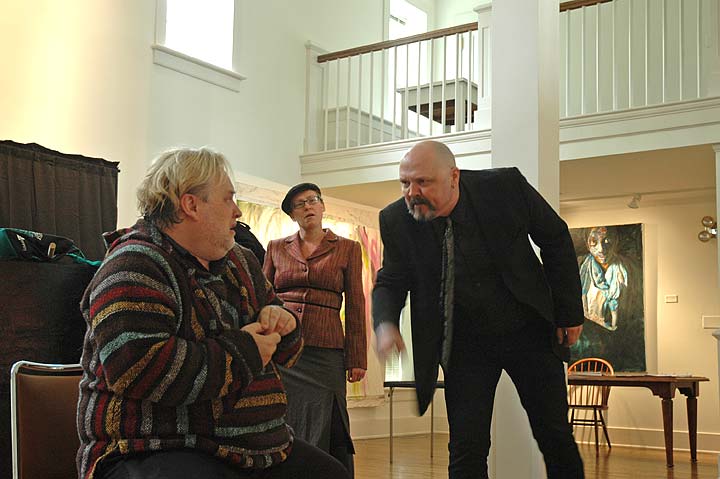 Members of the Yellow Springs Theater Company recently rehearsed for their upcoming production of “An Adult Evening of Shel Silverstein,” a collection of 10 short plays written by the renowned children’s author. The plays showcase Silverstein’s trademark offbeat humor, but take many more liberties with adult content, language and gallows humor. The production debuts this weekend. From left are Rob Campbell, Ellen Ballerene and J. Gary Thompson. (photo by Dylan Taylor-Lehman)