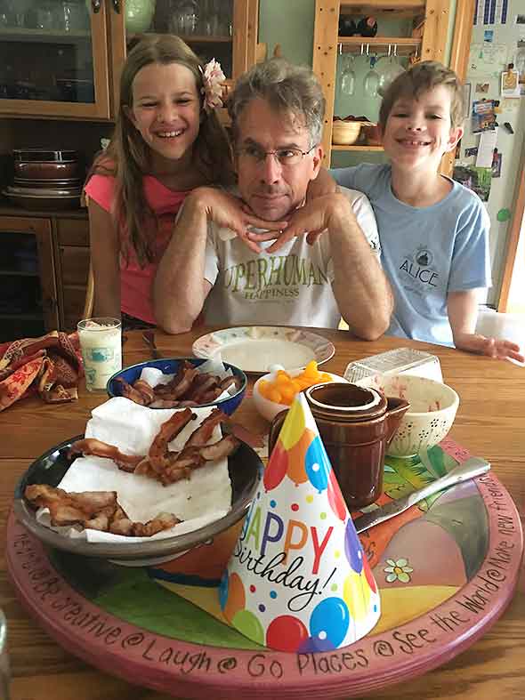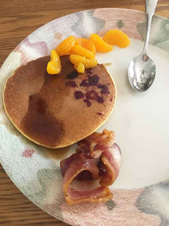 Our hands—and faces—come away smeared with excess. For the morning’s celebratory breakfast, we loaded up our pancakes with black raspberries and piled our plates with sizzling bacon. We are grateful and satisfied, feeling blessed and happy in a moment, each one of us wrapped snuggly in relief.