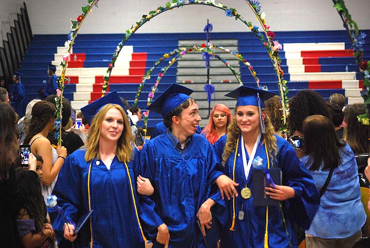 The Yellow Springs High School Class of 2017 walked through the venerable flowered hoops Thursday, May 25, and into a larger world. Above, Danielle Worsham and Olivia Chick flank Alex Oliver on their way from the stage. Several other events marking major moves took place around the same time: Mills Lawn School held its promotion ceremony May 23 and McKinney Middle School eighth-graders celebrated their becoming freshmen. The traditional Mills Lawn sixth-grade clap-out took place on Friday of that week. (Photo by Aaron Zaremsky)