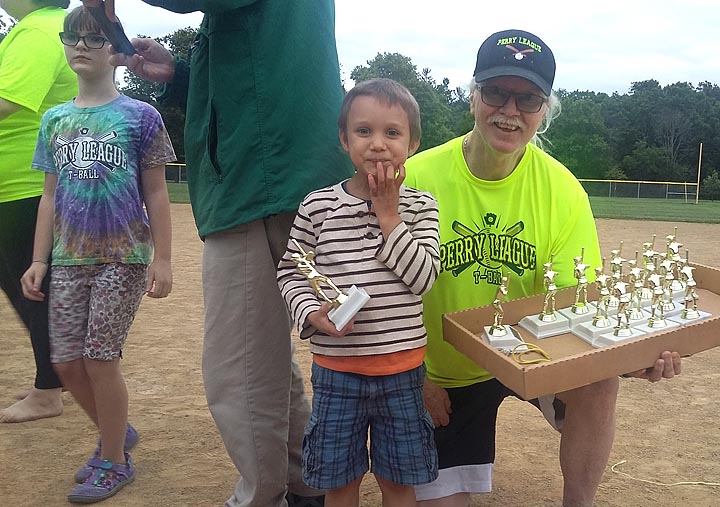 More than 50 kids and 150 adults celebrated another summer of Perry League T-ball at last Friday night’s end-of-summer potluck. The evening included fence-climbing and anthem-singing, plus the usual T-ball antics and fun. Shown above are Maddie McGuire and Zander Breza with Coach Jimmy Chesire. (Sbmitted photo)