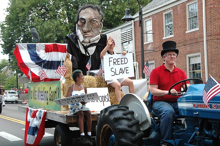 The local effort to erect an “over-life-size” bronze statue of Wheeling Gaunt made a splash at the Yellow Springs Fourth of July parade this summer. Project steering committee member Dave Neuhardt, president of the the Yellow Springs Historical Society, is behind the tractor wheel. Visible on board the float, which featured a papier-maché depiction of Gaunt’s head, are Malaya Booth and Bob Huston. (Archive photo by Diane Chiddister)