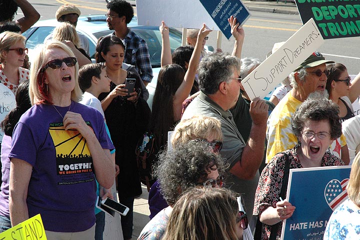 Yellow Springs resident Susan Alberter (left front), the driving force behind Greene County Indivisible: Awake and Watching, was among a number of group members who participated in a rally Tuesday, Sept. 5, in downtown Dayton to protest the president’s efforts to rescind President Barack Obama’s executive order known as DACA, or Deferred Action for Childhood Arrivals. An estimated 100 people, many from Yellow Springs, gathered outside U.S. Rep. Mike Turner’s regional office to urge Turner to help retain the legal status of 800,000 young people called “Dreamers.” (Photo by Carol Simmons)