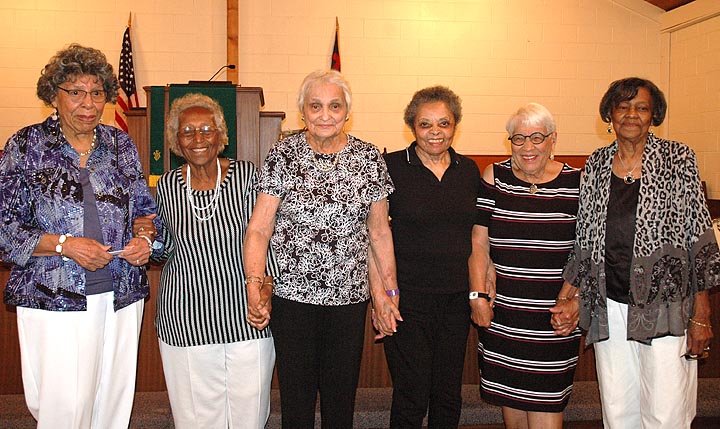 Six members of the Victorettes held hands and sang at Central Chapel A.M.E. Church on Sunday, Sept. 3, capping off this year’s well-attended reunion. From left are Phyllis Jackson, Dorothy Allen, Marie Payton, Dorothy Boyce, Betty Ford and Isabel Newman. All were members of the singing and service group founded by Boyce in 1944 and active until 1946, with friendships that have lasted a lifetime. (Photo by Audrey Hackett)