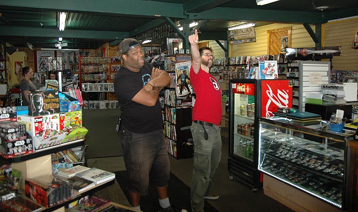 Super-Fly Comics and Games celebrated its 10th anniversary Saturday, Sept. 2. Pictured here inside the store are owners Jared Whittaker, left, and Anthony “Tony” Barry. Super-Fly sells comics, graphic novels, books, toys, action figures, board games, role-playing games and more. The store pulled in lots of fans Saturday, setting the record for its single biggest sales day ever. (Photo by Aaron Maurice Saari)