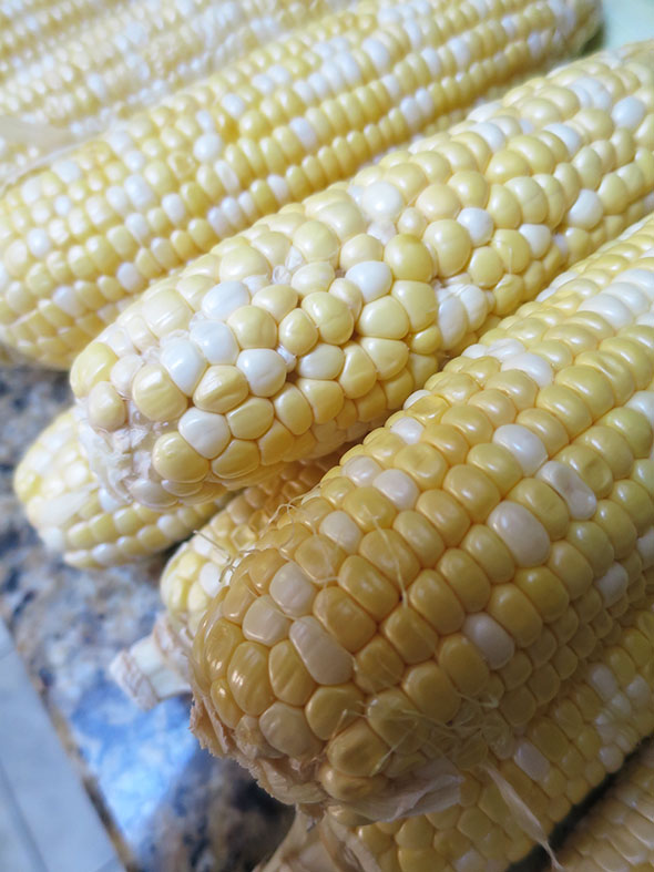 Since the corn is ready—a cherry yellow—my first task is to get out the stick pot and start a rolling boil of water.