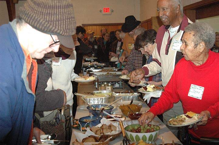 Those who attend are asked to contribute a dish for the meal, although no one will be turned away. Traditional, vegetarian and vegan dishes are welcome. Attendees will serve themselves buffet-style, then sit with others at long tables. Over the years, the Thanksgiving dinner has become a popular local event, where villagers mingle with old friends and make new ones.