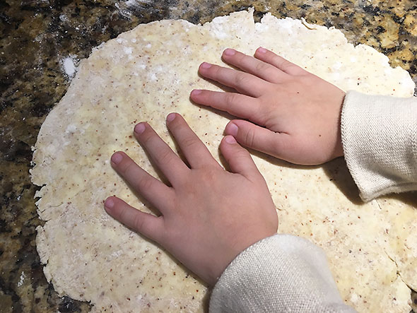 Five minutes to go, I cleared the counter off to make room for rolling pins. When the alarm chimed, I set my son to the fridge to pick out one pad of dough and then to the pantry to select a rolling pin. He came back with the largest one he could find.