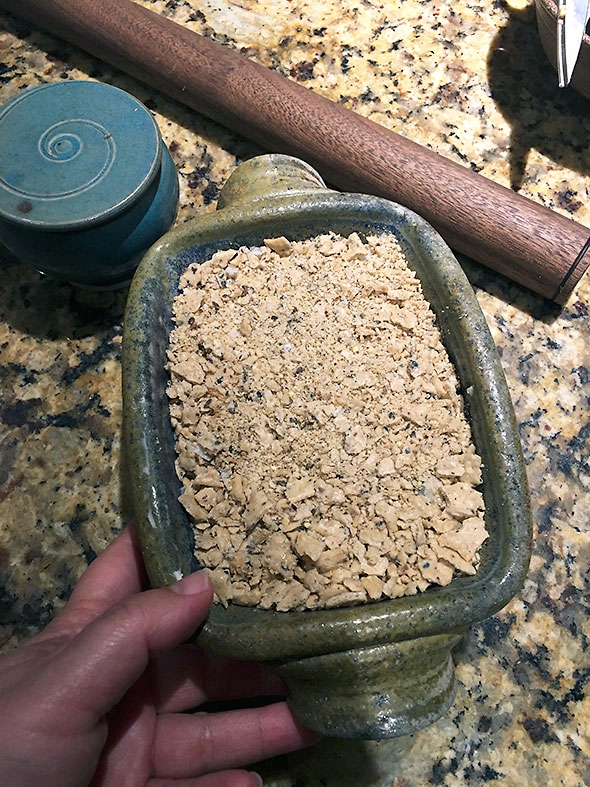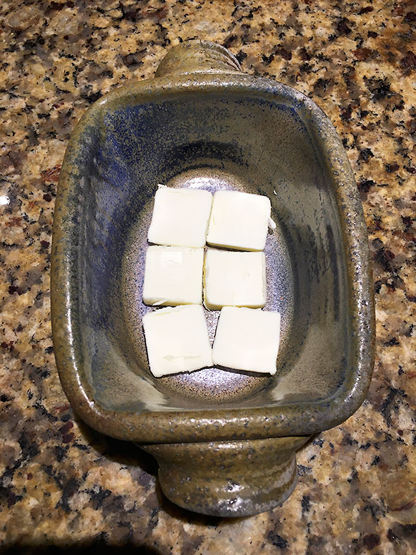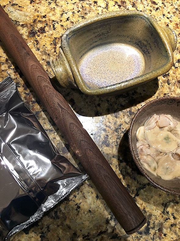 Use oyster crackers, he tells me. I don’t know where to find them but at Current Cuisine I have found a favorite cracker free of gluten and full of nutty flavor. I decide to try them as substitute. Though my father says to layer alternately with cracker, oyster, butter, I look on the bottom of my baking dish from Miami Valley Pottery and decide to flip the stack.