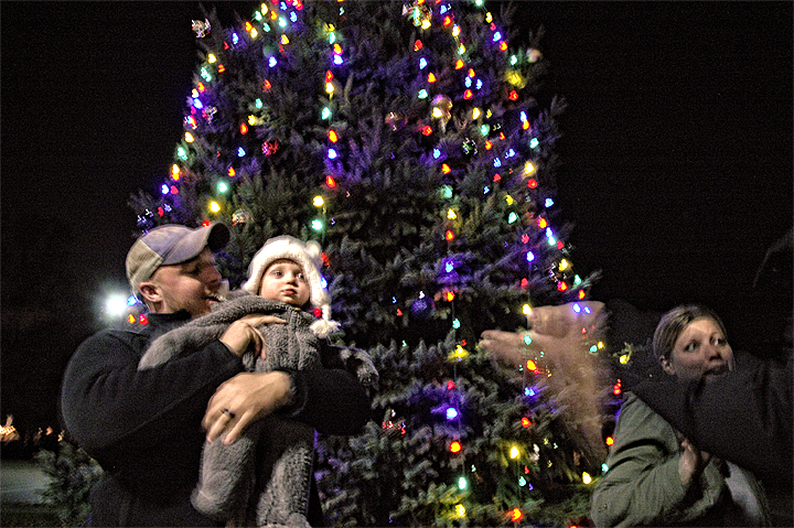 The annual lighting of the village tree at the corner of Xenia Avenue and Limestone Street attracted about 20 spectators — inlcuding Assistant Village Manager Melissa Dodd, at right, husband Dalton and little Stella — who all clapped at the sudden burst of bright color. Pretzel ball snacks were provided by the Yellow Springs Chamber of Commerce, while warmth was provided via hot chocolate courtesy of Dino’s Cappuccinos.