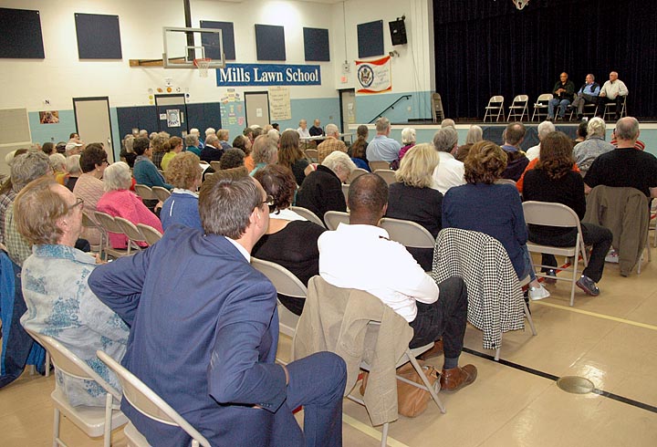 The event, which attracted about 130 people, took place at the Mills Lawn School gym, with Fred Bartenstein as facilitator. During their five-minute introduction, candidates were asked to address what they see as the most important challenges facing the local school district.