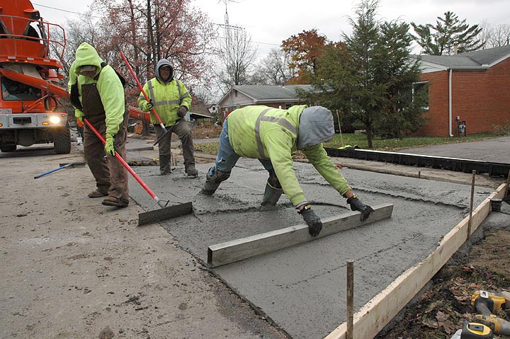 Several workers from Axis Civil Construction in Columbus poured concrete last week for a new sidewalk along the east side of Winter Street, part of the Safe Routes to School project. Shown above, crew leader Jacob Powell smoothed concrete after the pour. The project also includes a new section of sidewalk on Fairfield Pike from Fair Acres to Winter, in an effort to enhance safety for children walking to school. (Photo by Diane Chiddister)