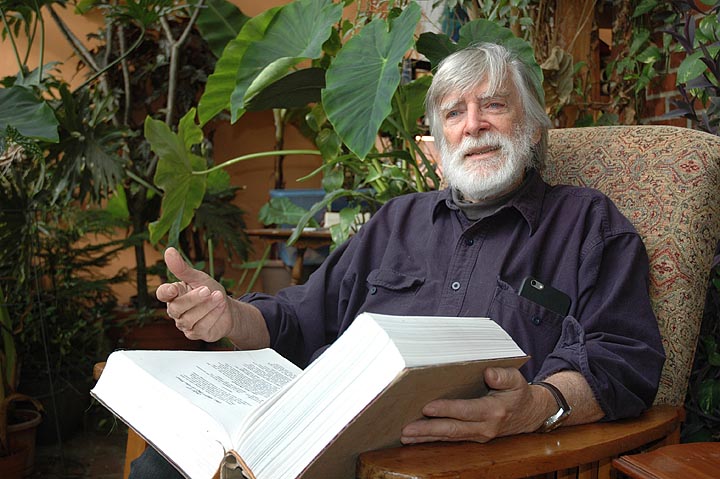 Local almanac writer Bill Felker recently published a new book, “Home Is the Prime Meridian,” a collection of nature essays drawn from his News columns and elsewhere. Pictured here in his greenhouse with a bound version of his daybook, Felker recalled how his wife’s gift of a barometer in 1972 got him started on observing weather patterns and other natural phenomena. (Photo by Audrey Hackett)
