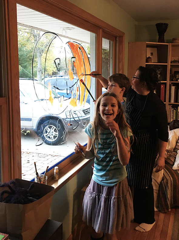 We kept our mural up on the bay window through the Thanksgiving holiday. When the kids returned from visiting cousins, they declared time for a new mural. My husband set them up with adult tools—razored scrappers and Windex—and the kids took down their creation in the same happy comradery in which they put it up. To replace the pumpkin, we chose a reindeer, a nod to my son’s professed spirit animal. By nightfall, we rendered a leaping stag with a beaming red nose.