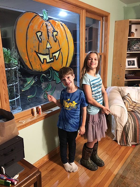 Look how well the front window turned out, I told myself. We painted the window first for beggars night at the end of October. As in prior years, I soaped a drawing of a jeering jack-o-lantern on the front bay window. I was painting the outline in black when the kids gathered around. They picked up paint brushes and elbowed their way in. I stood back and let them work. Simple as that. It was fun to watch them. I walked outside to stand on the opposite side of the pane. As I watched, the details of the orange globed ghoul magically filled in. I peaked through parts of the unpainted glass and caught the kids’ smiles, grinning ear to ear as side by side they made steady progress. That simple sketch came into vibrant colorful relief.