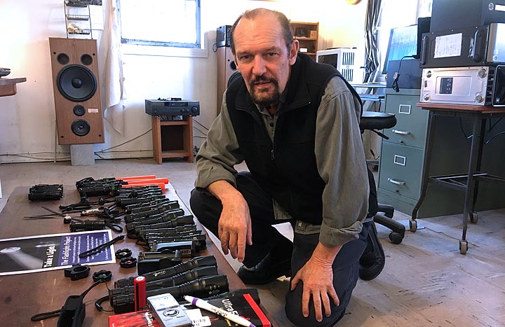 Landaburu’s most compact and affordable model is a palm-size unit, powered by a rechargeable battery. It can project up to 1,200 lumens — approximately 18 watts — of light. That’s a whole lot of illumination: the kind that would suffice for caving or search and rescue missions.