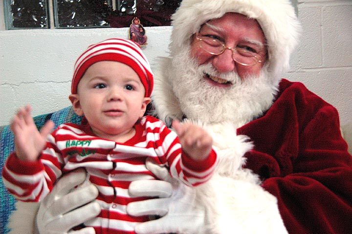 Carter McAllister, great-grandson of villager Patti McAllister, sized up Santa in his first visit at last Saturday’s Breakfast with Santa at the United Methodist Church. While it was touch-and-go for a while, Carter eventually gave the jolly red-suited guy a thumbs-up. Carter and his father, Jake McAllister, of Dayton, came to Yellow Springs to visit Jake’s grandmother, and to attend the annual holiday event, which was crowded with kids and parents.