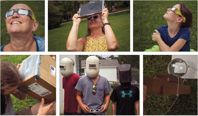 Yellow Springers — and most of the United States — spent the afternoon of Aug. 21 staring up at a waning midday sun as the moon moved across its face. The eclipse was partial here — 89 percent — but still well worth seeing. From top, clockwise, Karen Gardner caught a glimpse; Rebecca Holihan went old-school with a plate of candle-sooted glass; Olive Cooper glanced up; a lens focused the image safely on a white piece of paper; Gavin Van Meter, Trinidad Speck and Quinn Van Meter wielded welding masks, a safe yet slightly creepy viewing apparatus; James Crawford used a pinhole box to image the phenomenon. (Submitted photos by Matthew Collins)