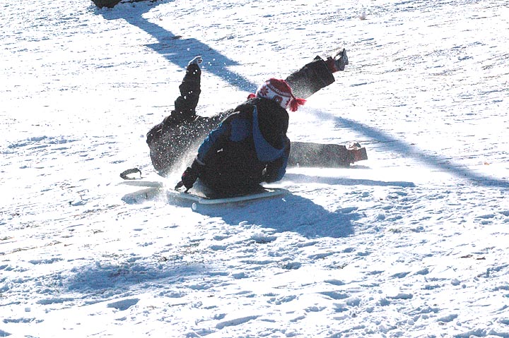 New Year’s Day is rife with rituals and traditions, one of which is the annual Ultimate Frisbee game, above, now in its 22nd-or-so year. Lore has it the tradition originated with Antioch College students on campus and eventually moved to Gaunt Park. Meanwhile, a handful of hardy sledders took to Gaunt Park Hill, attempting the ultimate quest of “catching air” when shooshing over a hump of snow. Noah Horn, at right, found out just how difficult a sled is to steer towards that hump. Above him, Vaughn Hendrickson learned the same lesson.
