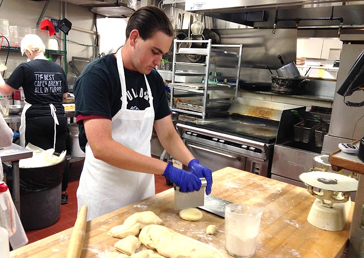 As a member of Yellow Springs High School’s Bulldog Brigade, junior Harper Mesure has completed a variety of temporary job placements around town, including at The Winds Cafe, above, where owner Mary Kay Smith was so impressed with his work, she hired him part time. (Submitted Photo by Sylvia Ellison)